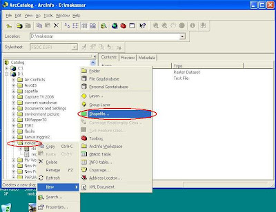 Pembuatan “shapefile” dilakukan dengan menggunakan arccatalog. File shp tersebut dapat ditampilkan untuk diedit di arc map. Prosedur yang dilakukan adalah:
